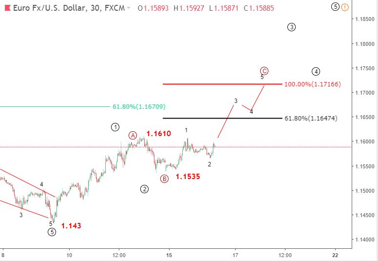 Với sự hồi sinh tăng hiện tại, nó đủ để nói sóng B (vòng tròn) đã hoàn thành. Wave C đã bắt đầu và sẽ được xác nhận khi giá phá vỡ trên 1.1610. Có ba mức Fibonacci quan trọng được nhóm giữa 1,1650-1,1716. Nếu xu hướng tăng giá tiếp tục, giá sẽ được kỳ vọng sẽ phát quanh vùng này. Nếu đà tăng mạnh hơn và phá vỡ trên 1.1716 lên 1.1750, đà tăng từ 1.143 có thể sẽ là sóng impluse. Nếu không, giá sẽ được dự kiến sẽ giảm xuống dưới mức 1,1750 và tái khởi động động thái giảm giá lớn hơn.