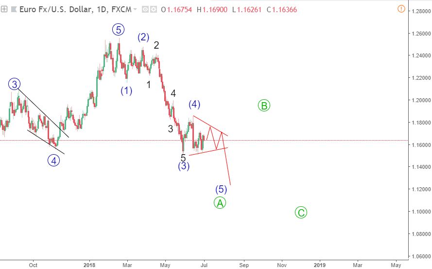 Mô hình sideways pattern khác là hình tam giác (triangle). Tam giác xảy ra thường xuyên hơn so với Flats và thường đáng tin cậy hơn. Sự phục hồi kể từ khi giảm từ 1.185 có thể có nghĩa là sóng (4) vẫn chưa hoàn thành. Sự phục hồi lên 1.185 có lẽ chưa hoàn thành sóng (4) và giá có thể tạo ra một mô hình tam giác. Chúng tôi trở lại khung thời gian lớn hơn để xem điều này rõ ràng như biểu đồ ở trên cho thấy. Tỷ lệ cược vẫn ủng hộ những con gấu từ quan điểm phân tích kỹ thuật mặc dù giá có thể di chuyển. Ở cấp độ này, khi các mô hình sóng không đủ rõ ràng, ý kiến và dự báo thay đổi nhanh chóng và kiên nhẫn là cần thiết. Kịch bản đầu tiên trông gần hơn với thực tế hiện tại so với kịch bản thứ hai mà vẫn còn một số cách để đi. Hãy theo dõi cập nhật tiếp theo để biết kịch bản nào đang diễn ra.