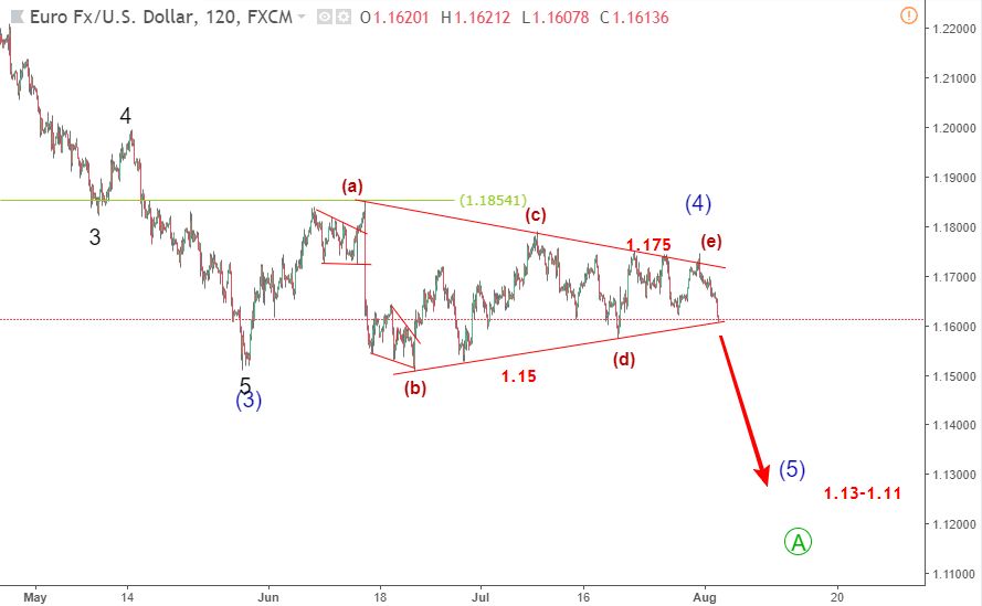 Xu hướng giảm hiện tại là nhanh và nhanh. Nếu có sự bứt xuống dưới (b) – (d) đường cơ sở của tam giác, chúng ta nhiều khả năng sẽ thấy giá tại 1.15, 1.13 và 1.11. Trừ khi một chu kỳ tăng nhanh khác xảy ra trên 1.175, đường giảm giá sẽ tiếp tục hoàn thành sóng thứ 5 của sóng impulse giảm trong năm. Hãy chú ý theo dõi cập nhật tiếp theo.