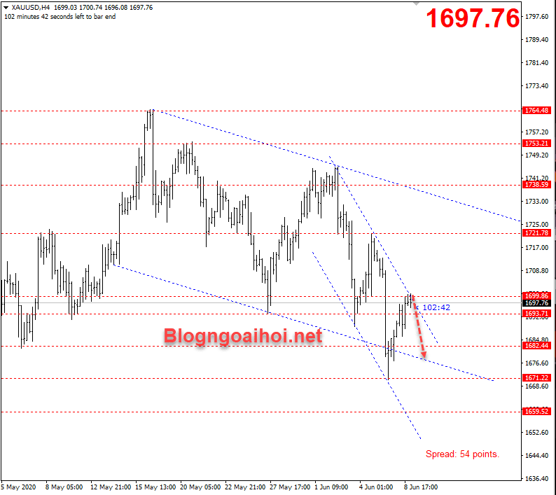 Vàng thế giới hiện đang chạy trong kênh giá giảm nhỏ trên chart H4. Vùng kháng cự tâm lý quanh 1700 có thể sẽ giúp vàng quay lại giảm.