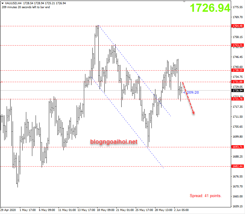 Chiến lược tham khảo : Vàng 3/6 – Bán 1730-1732, Stop 1735, TP 1720-1700.