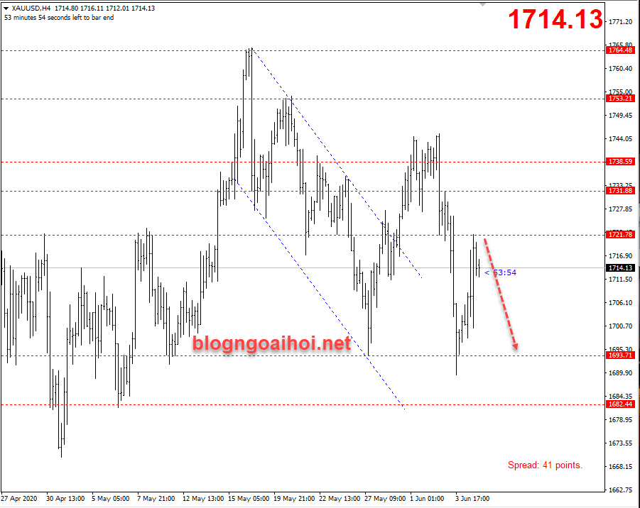 Chiến lược tham khảo : Vàng 5/6- Bán 1718-1720, Stop 1723, TP 1710-1700.