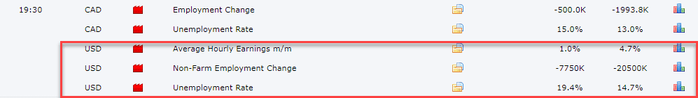Vào lúc 19:30 tối nay, bảng lương phi nông nghiệp Mỹ tháng năm sẽ được công bố. Thị trường nói chung dự kiến sẽ giảm 8 triệu người, và giá trị trước đó sẽ là 20,537 triệu người. Đồng thời, tỷ lệ thất nghiệp tháng 5 ở Mỹ cũng sẽ được công bố. Thị trường dự kiến là 19,5%, tăng từ 14,7% trong tháng 4.