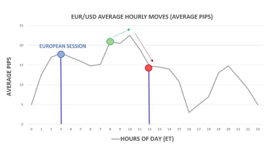 Như đã thấy trong hình trên, mức độ biến động tăng lên tối đa từ 8h00 đến 12h00 theo giờ ET (19h00 đến 23h00 theo giờ Việt Nam) – khi khoảng thời gian giao nhau giữa phiên ngoại hối London và phiên New York.