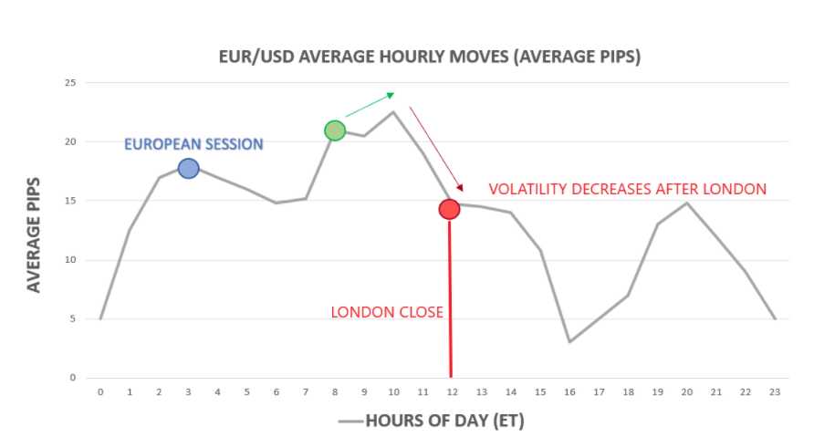 Khi thị trường ngoại hối phiên London đóng cửa, sự biến động có xu hướng giảm. Từ đồ thị tương tự, cho thấy biến động trung bình theo giờ trong ngày của tỷ giá EUR/USD, chúng ta có thể thấy nhịp giao dịch khác biệt rõ rệt trong biến động trung bình theo giờ ở cuối phiên giao dịch New York.
