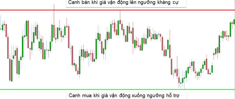 Sử dụng chiến lược Range Trading, các nhà giao dịch tận dụng các mức hỗ trợ và kháng cự. Đồ thị dưới đây cho thấy một ví dụ về chiến lược giao dịch Range Trading. Khi giá di chuyển lên ngưỡng kháng cự (đường màu đỏ) các nhà giao dịch sẽ tìm cách để bán (short) cặp tiền tệ. Khi giá di chuyển đến vùng hỗ trợ (đường màu xanh), các nhà giao dịch sẽ tìm cách để mua (long) cặp tiền tệ.