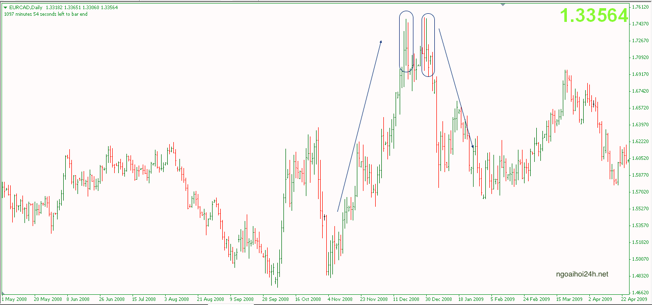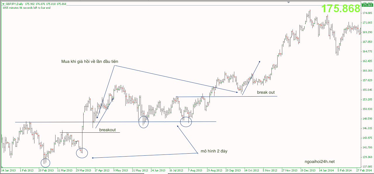 Như ví dụ trên, giá bật lên từ mô hình 2 đáy ( vùng tròn). Xu hướng mới hình thành. Vì vậy, bạn nên mua vào khi giá hồi lại lần đầu ( Chỗ mũi tên), sau khi breakout.