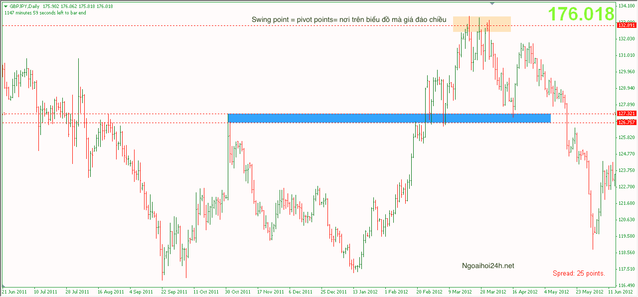 Điểm đảo chiều – swing point- còn được gọi là pivot points- là nơi trên biểu đồ mà giá đảo chiều. Nhưng không phải swing point nào cũng quan trọng như nhau. Sự thực là bạn quyết định mua trong một đoạn hồi thì nên dựa vào swing point trước đó. Ví dụ :
