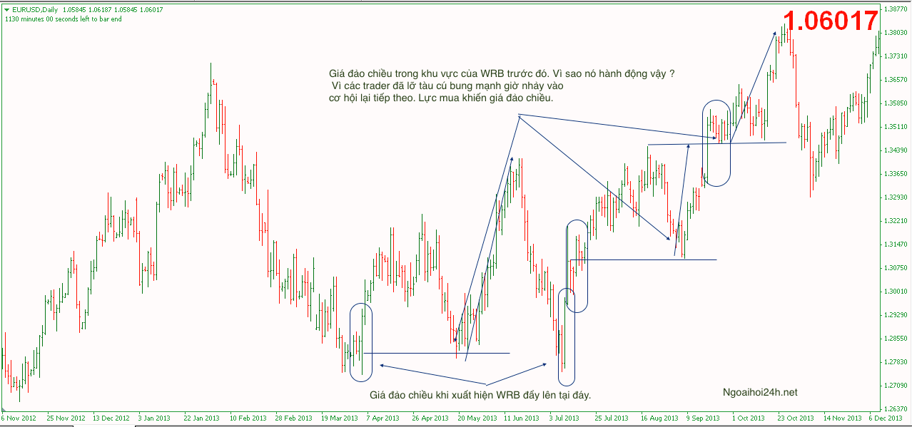 Giá đảo chiều trong khu vực của WRB trước đó. Vì sao nó hành động vậy ? Vì các trader đã lỡ tàu cú bung mạnh giờ nhảy vào cơ hội lại tiếp theo. Lực mua khiến giá đảo chiều.