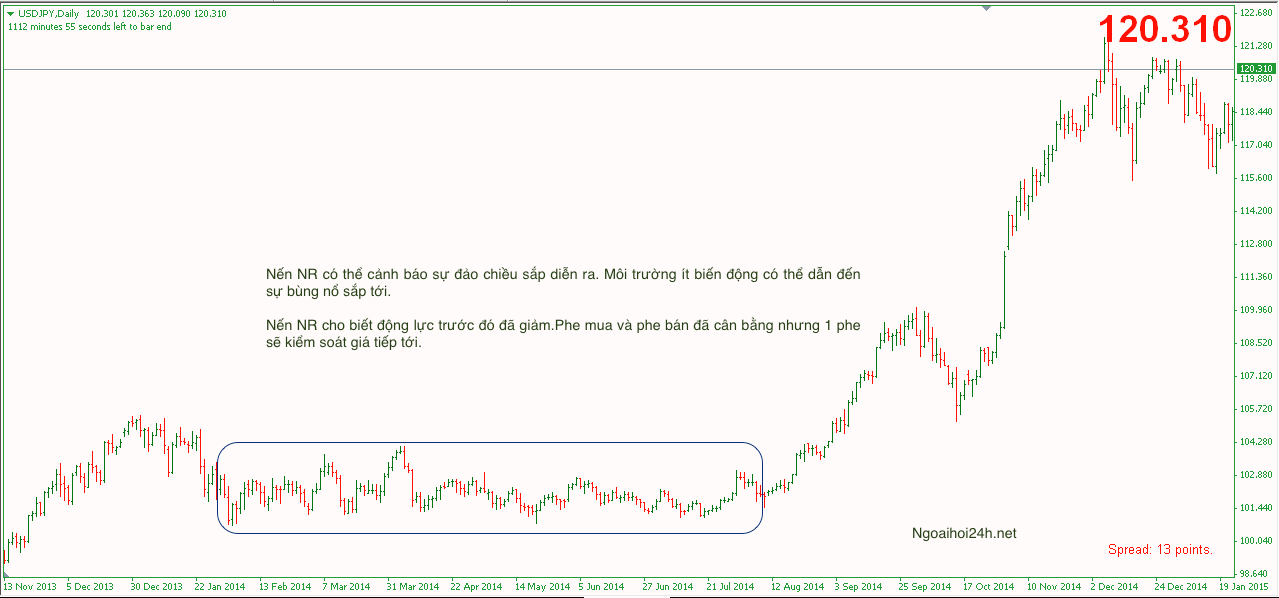 Mẹo 4: Bar thân nhỏ ( Narrow range- NR) Cảnh báo sức bật mạnh sắp đến.
