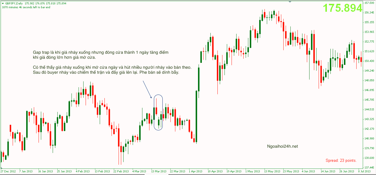 Cái này quan trọng đối với chứng khoán. Gap trap là khi giá nhảy xuống nhưng đóng cửa thành 1 ngày tăng điểm khi giá đóng lớn hơn giá mở cửa.