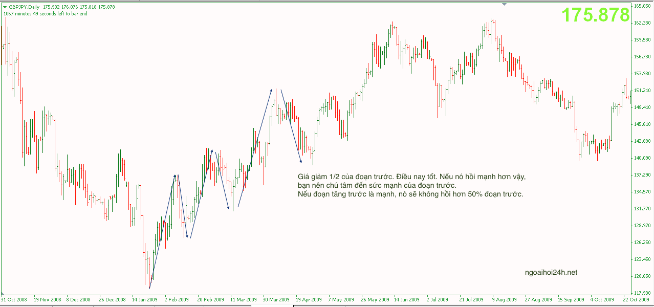 Giá giảm 1/2 của đoạn trước. Điều nay tốt. Nếu nó hồi mạnh hơn vậy, bạn nên chú tâm đến sức mạnh của đoạn trước. Nếu đoạn tăng trước là mạnh, nó sẽ không hồi hơn 50% đoạn trước.
