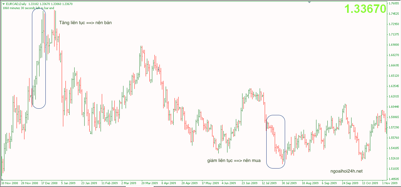 Thường giá hay đảo chiều sau 1 chuỗi ngày tăng hay giảm liên tục. Ví dụ.