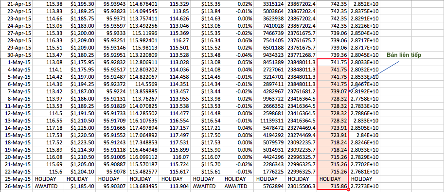 Cách tính các phiên liên tục : Các bạn có thể nhìn vào ngày giao dịch và sự tăng giảm của khối lượng giao dịch! nếu ngày 21/5 mà khối lượng nắm giữ là 715,26 tấn, mà ngày 22/5 vẫn là 715,26 tấn, thì tức là ngày 22/5 không có giao dịch mua bán nào diễn ra, còn nếu ngày 26/5 mà khối lượng nắm giữ là 715,86 tấn, thì tức là ngày 26/5 có giao dịch mua vào 0,6 tấn!