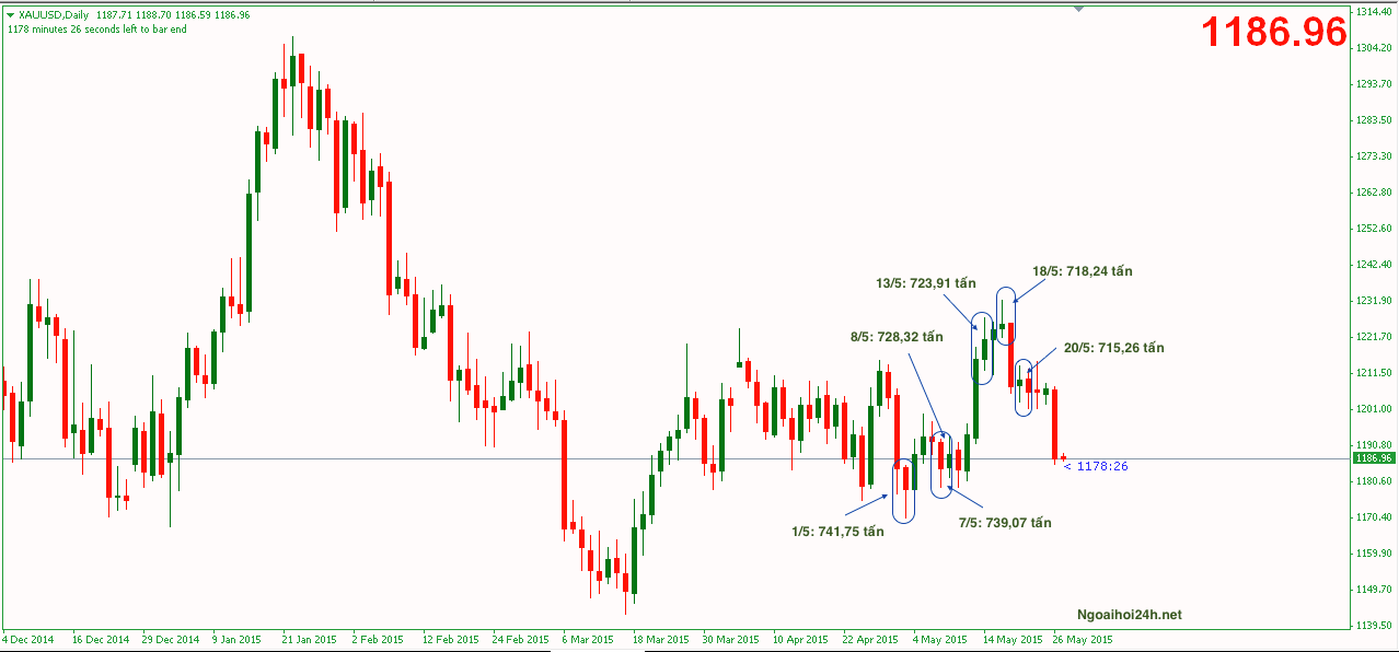 Từ đầu tháng 5 đến 26/5 quỹ SPDR đã bán 5 phiên liên tiếp với khối lượng tổng cộng lên khoảng 26 tấn vàng. Nhìn vào hình ảnh các bạn cũng thấy là 3 phiên đầu tiên giá có xu hướng tăng mặc dù quỹ này thì đang bán ra, nhưng đến phiên thứ 4, 5 thì giá đã giảm trở lại.