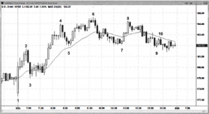 Chart GS hình thành mô hình Double Bottom Bull Flag với nến số 5 và nến số 7 trong hình dưới. Và mặc dù giá hình thành đỉnh cao hơn tại vị trí chính giữa 2 nến 5 và 7, ta vẫn có thể xem vị trí này đã hình thành mô hình DBBF. Nến số 5 là lần cuối cùng giá hình thành đáy cao hơn (Higher Low). Vị trí này rất quan trọng đối với một xu hướng tăng, nếu trường hợp giá có thể đâm xuyên qua vùng này trên chart, chúng ta sẽ nghĩ nhiều đến trường hợp giá đã đảo chiều hoặc thị trường sideway hơn là giao dịch theo xu hướng cũ.