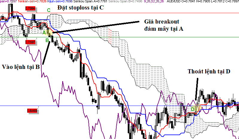 Tóm lại, trong trường hợp này, trader sẽ chờ điểm A (breakout đám mây), vào lệnh tại B, đặt stoploss tại C và chốt lời tại D.