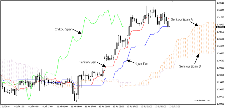 Hệ thống Ichimoku Kinko Hyo gồm 5 thành phần (đường-line). 5 đường này kết hợp với nhau để vẽ nên 1 bức tranh Ichimoku tổng thể.