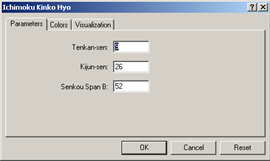 Và 3 thông số cơ bản và mặc định: Tenkan-sen, Kijun-sen và Senkou Span B.