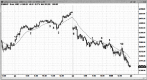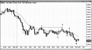 Nhiều Trader đã vào lệnh bán trước đó bị buộc phải thoát lệnh (để bảo toàn lợi nhuận, hoặc giảm lỗ nếu sell trễ). Và như vậy, giá không những bẫy bên mua mà còn bẫy cả bên bán. Tuy nhiên, khả năng giá đi xuống vẫn có sự hỗ trợ từ phía người muốn vào thêm lệnh bán (để đi theo xu hướng giảm cũ). Sự di chuyển chậm chạp của giá từ nến số 3 phản ánh đúng với tính chất di chuyển của thị trường trước đó (từ nến số 2), tuy nhiên kết quả cuối cùng là giá vẫn đến vùng giá thấp nhất của ngày hôm đó.