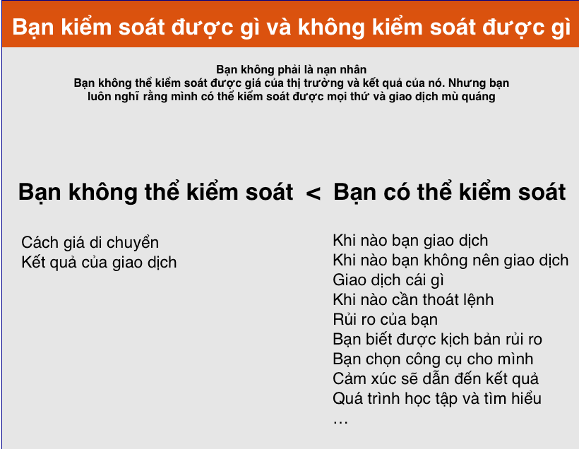 Hình ảnh bên dưới sẽ so sánh những việc mà chúng ta không thể kiểm soát được và những thứ có thể kiểm soát được trong giao dịch của mình. Thoạt nhìn, rõ ràng là 90% các Traders đều tập trung vào bên trái và họ thường cố gắng kiểm soát những việc mà họ không kiểm soát được. Thậm chí họ còn hoàn toàn mù quáng với thực tế, rồi tự đỗ lỗi cho mọi thứ và xem như mình là một “nạn nhân”.