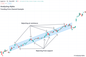 Hình trên cho thấy kháng cự hỗ trợ tạo thành một vùng giá đi ngang. Giá dao động trong 2 ngưỡng này. Nhưng đôi khi giá cũng hoạt động trong ngưỡng hỗ trợ kháng cự song song theo hướng đi lên hoặc xuống như hình bên dưới: