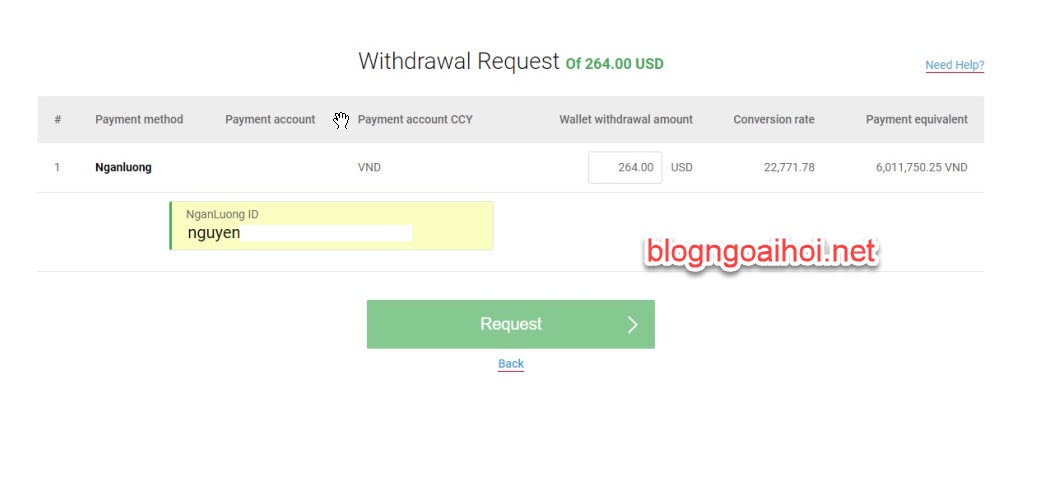 Bạn chọn phương thức rút tiền “Ngân lượng” và điền thông tin email mà bạn dùng để đăng ký tài khoản “Ngân lượng”.