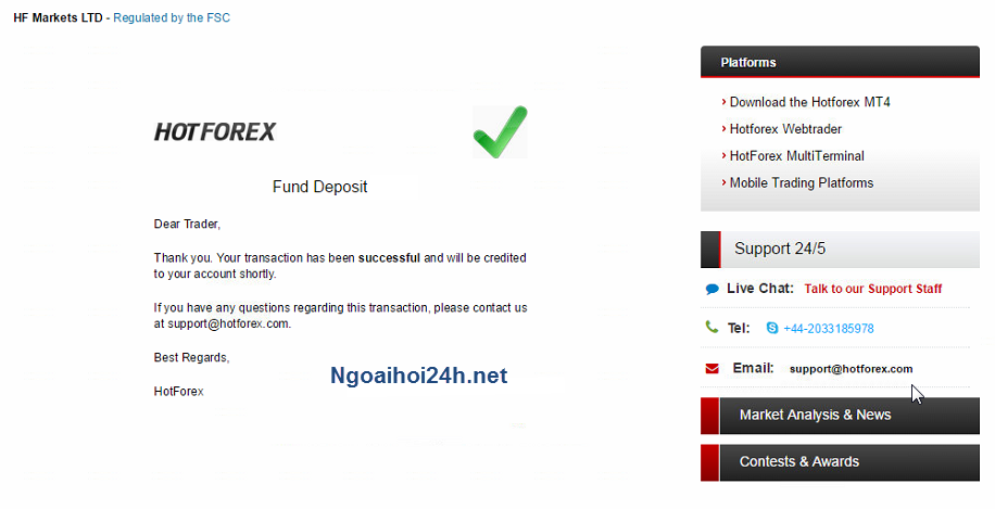 Sau đó bạn đăng xuất khỏi Tài khoản HotForex và 5 phút sau đăng nhập lại. Bạn sẽ thấy tiền nạp của bạn đã vào ví Wallet. Tiếp theo bạn làm lệnh chuyển nội vào Tài khoản MT4 HotForex. Nếu chưa rõ cách chuyển bạn nên xem bài viết Hướng dẫn chuyển nội trong cổng thông tin HotForex.