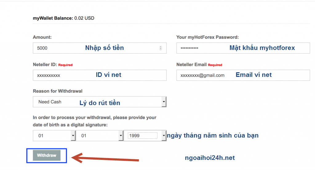 Cuối cùng chọn Withdraw. Với hình thức rút tiền bằng ví điện tử Neteller thì sau khoảng 24h tiền sẽ về ví của bạn (nhanh là chỉ sau 1h bạn sẽ nhận được)