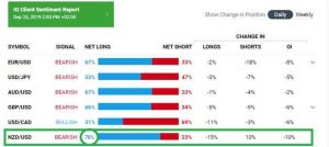 Bảng tóm tắt trên IG Client Sentiment hiển thị số lượng nhà giao dịch nắm giữ các vị thế mua so với số lượng nhà giao dịch nắm giữ các vị thế bán khống trong cùng một thị trường. Các nhà giao dịch nên quan tâm đến các mức cực đoan (net long hoặc net short cực lớn) khi phân tích tâm lý thị trường, vì đây là nơi công cụ cung cấp các tín hiệu rõ ràng nhất. Bạn có thể thấy trong hình bên dưới, có một con số net long tương đối cực đoan là 78% cho cặp NZD/USD.