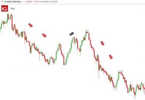 Quay trở lại ví dụ về NZD/USD, sau khi nhận ra rằng hầu hết các retail trader đều đang mua NZD/USD, một suy nghĩ thông thường là chúng ta cũng nên làm vậy – theo số đông. Tuy nhiên, khi nhìn vào biểu đồ NZD/USD bên dưới, có thể thấy rõ xu hướng giảm chủ đạo, mặc dù đám đông các trader vẫn đang mua ròng mạnh. Điều này có vẻ phản trực quan nhưng củng cố quan điểm rằng các nhà giao dịch bán lẻ có xu hướng là những người “thích” chống lại xu hướng.