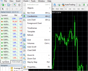 Candlesticks (phím tắt Alt+2) được nằm giữa Line Chart và Bar Chart, là 3 loại đồ thị phổ biến trong thị trường tài chính. Tuy nhiên trong MT4, bạn chỉ nên dùng Candlesticks.