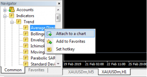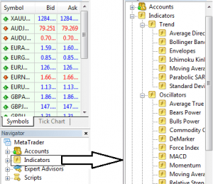 Indicator bao gồm toàn bộ các chỉ báo cơ bản có thể sử dụng để phân tích kỹ thuật, xác định xu hướng vào lệnh. Trong phần này, bạn chủ yếu sử dụng 2 nhóm chỉ báo chính là chỉ báo xu hướng (Trend) và nhóm các chỉ báo dao động (Oscillators). Mỗi 1 phần này sẽ bao gồm nhiều chỉ báo khác nhau, để hiển thị hết bạn chỉ cần nhấp vào dấu +. Muốn dùng chỉ báo nào nhấn chuột phải vào chỉ báo đó rồi chọn “attach to chart”.