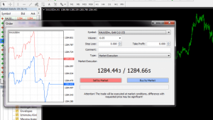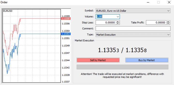 Dưới đây là ảnh chụp màn hình “Order” của cặp tiền EUR/USD. Dựa vào hình ảnh này, trader có thể thấy việc mua bán trên MetaTrader 4 vô cùng đơn giản. Để giao dịch theo giá Bid/Offer, trader cần điền khối lượng giao dịch (đơn vị Lot) vào ô ” Volume”. Sau đó, nhấp vào “Sell or Buy”, và chọn lệnh “Market Execution”