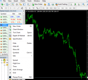 Symbols: Nơi hiển thị toàn bộ các cặp tiền tệ bạn muốn giao dịch với 3 mục chính Symbol, Bid và Ask. Sử dụng chuột phải vào mục Symbol bạn sẽ thấy hiện ra 1 bảng sau gồm: New order, Show all, Hide, Hide all, Chart window (có rất nhiều mục nhưng đây là những điểm quan trọng nhất bạn nên biết).