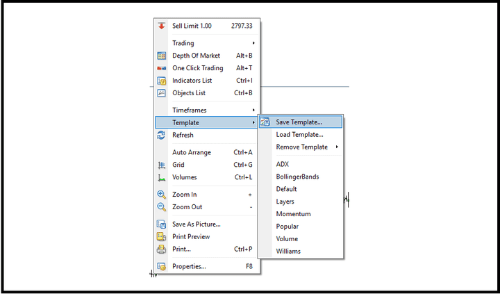 Template: Nút này thực sự vô cùng hữu ích nếu bạn đã thiết lập cho mình các indicator ưng ý, các biểu đồ của các cặp tiền bạn muốn xem nhất, và bạn muốn giữ đúng khuôn mẫu này cho những lần giao dịch sau thì bạn chỉ cần nhấn vào nút Template —> Save Template rồi đặt tên cho mẫu đồ thị đó. Nếu muốn sử dụng cho các lần sau, bạn chỉ cần vào lại Template và chọn mẫu theo tên là sẽ hiện ra.
