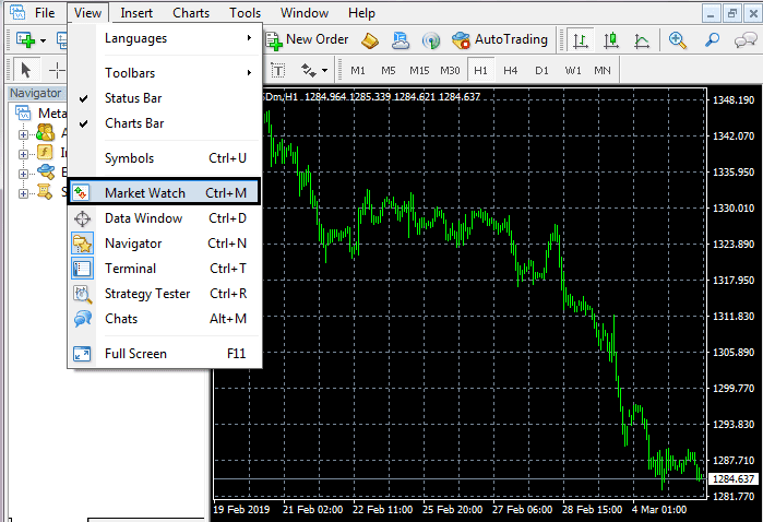 Nhấn vào Views bạn sẽ thấy hiện lên 1 bảng gồm các tính năng cơ bản, trong số này bạn cần quan tâm nhất chính là Martket Watch (danh mục này thường được để mặc định, nếu tại phần mềm của bạn không hiện ra thì chỉ cần nhấn phím tắt Ctrl+M.
