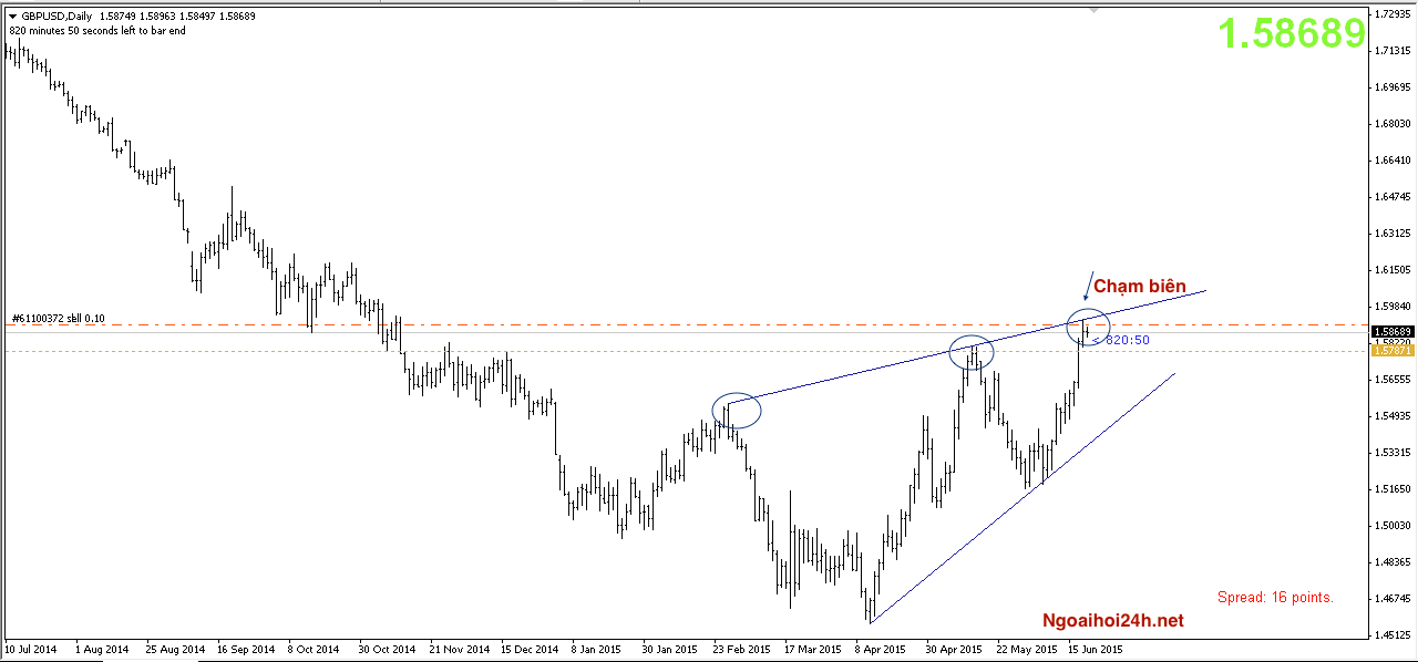 Đầu tiên, tôi xác định vùng cần giao dịch. Tôi nhận thấy trên chart D1 của GBPUSD, giá có khả năng giảm điểm khi chạm vào biên trên của trendline. Vùng bán xác định quanh 1.59-1.592x.