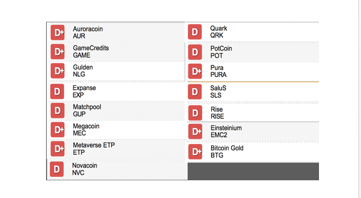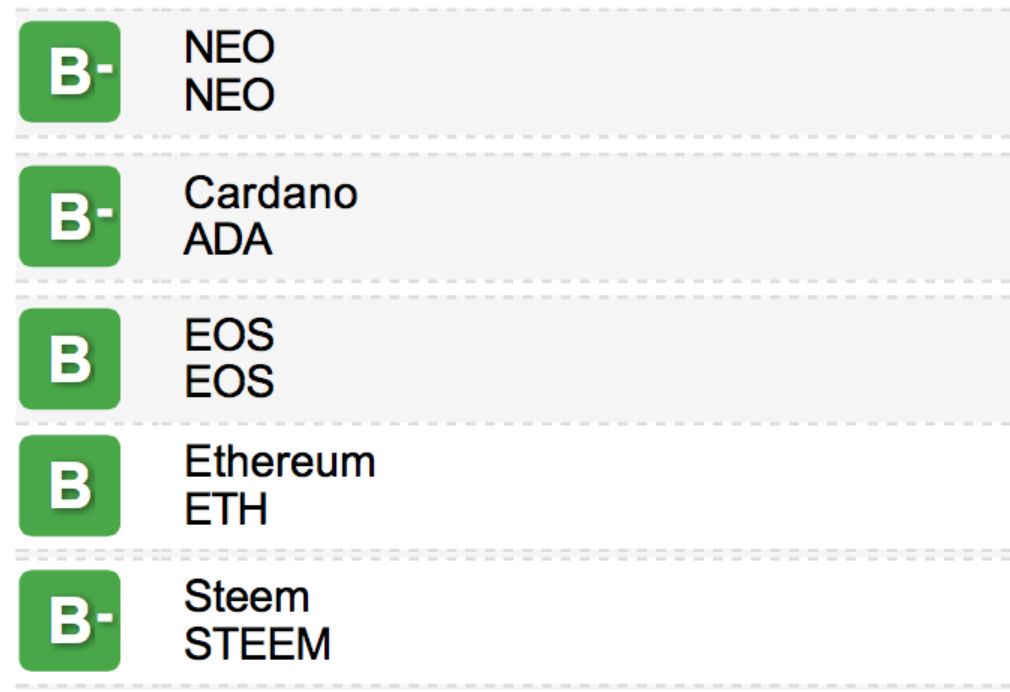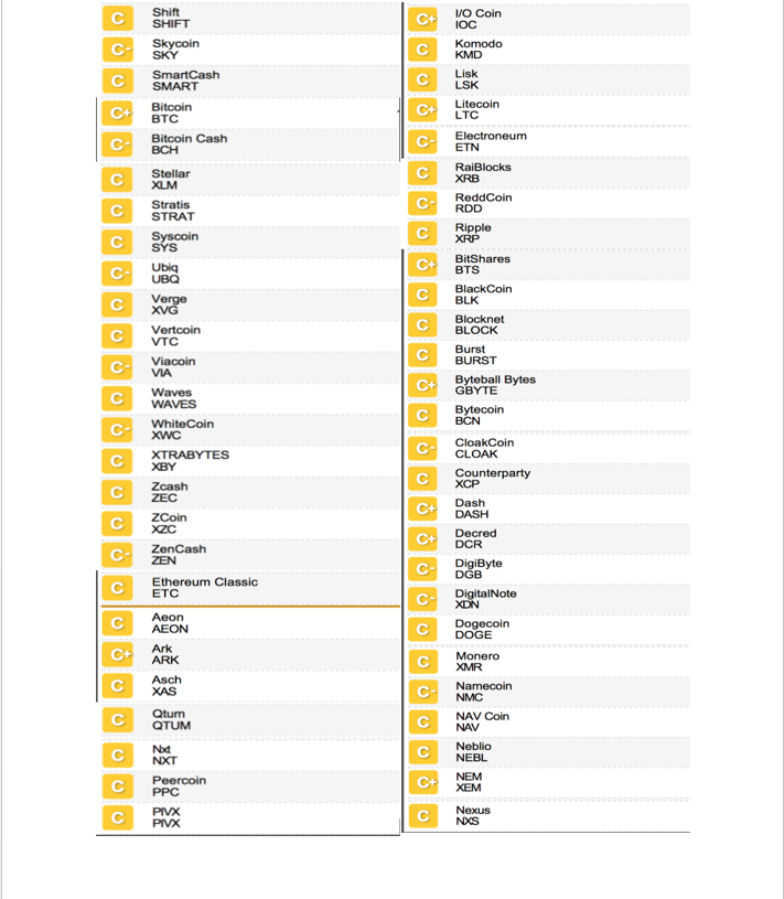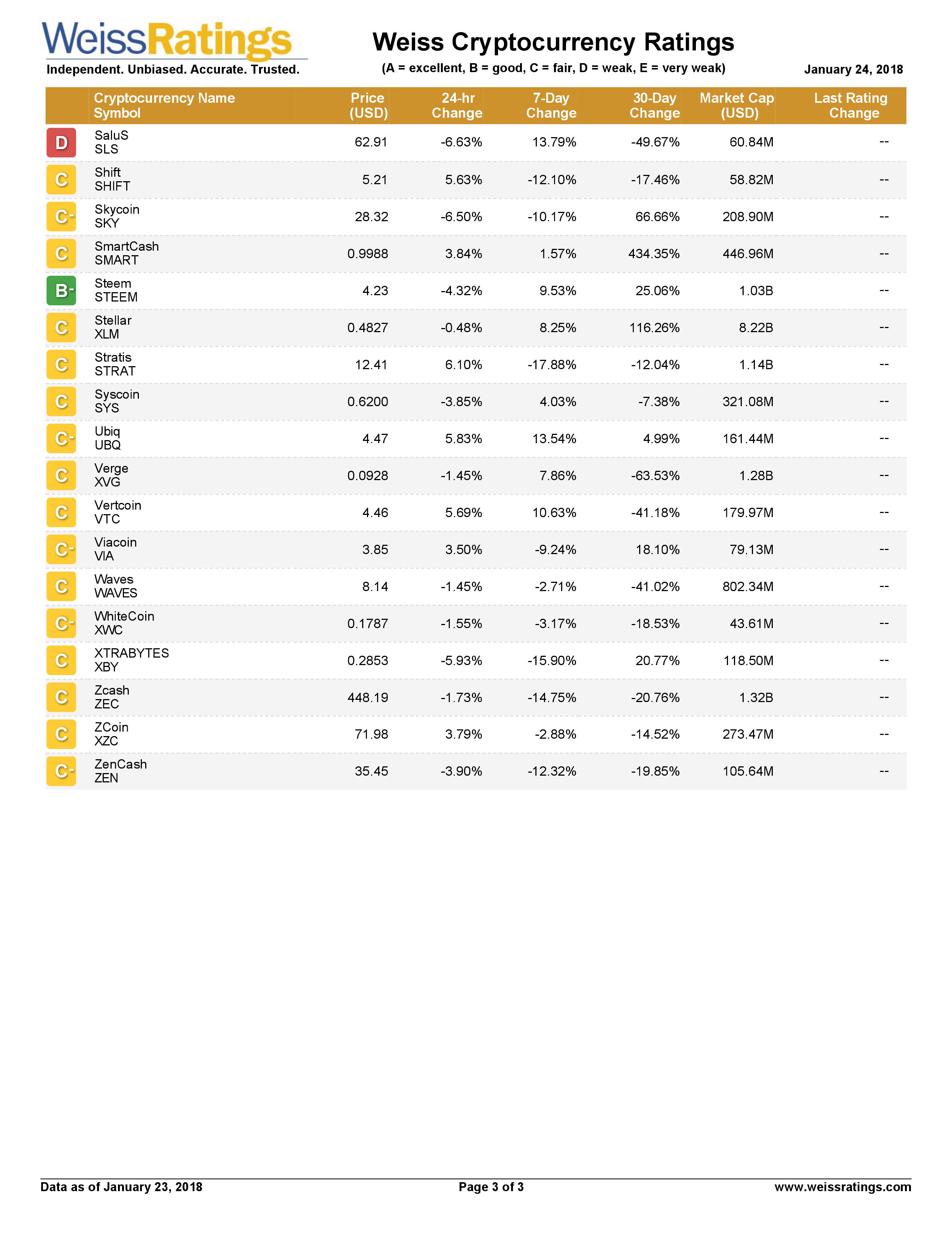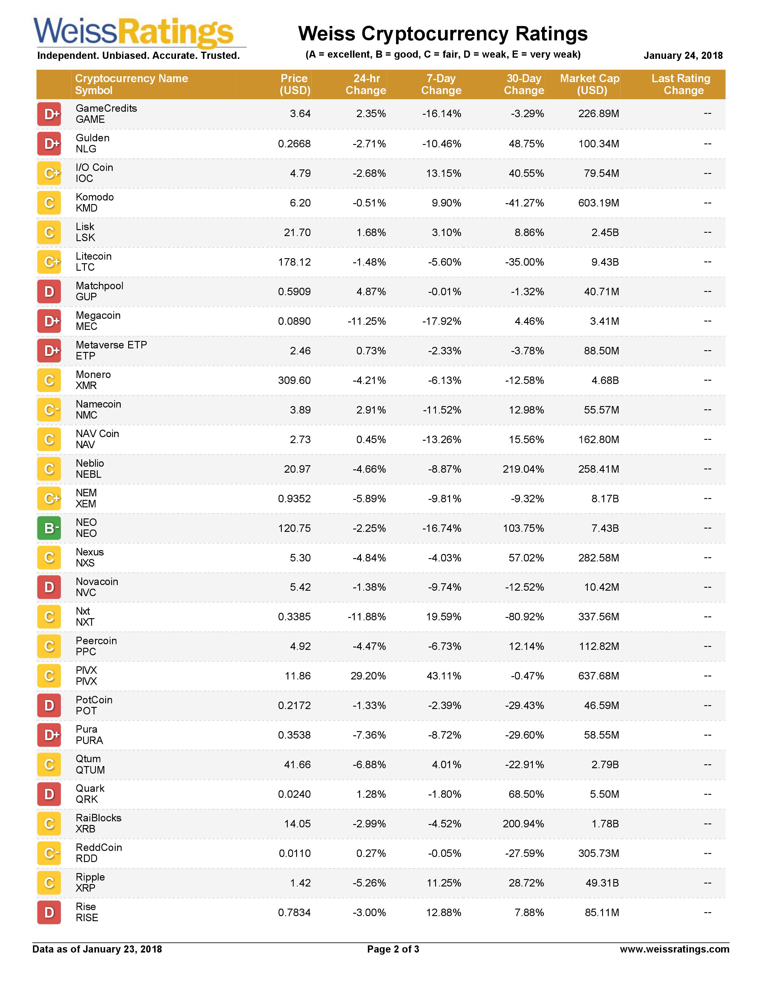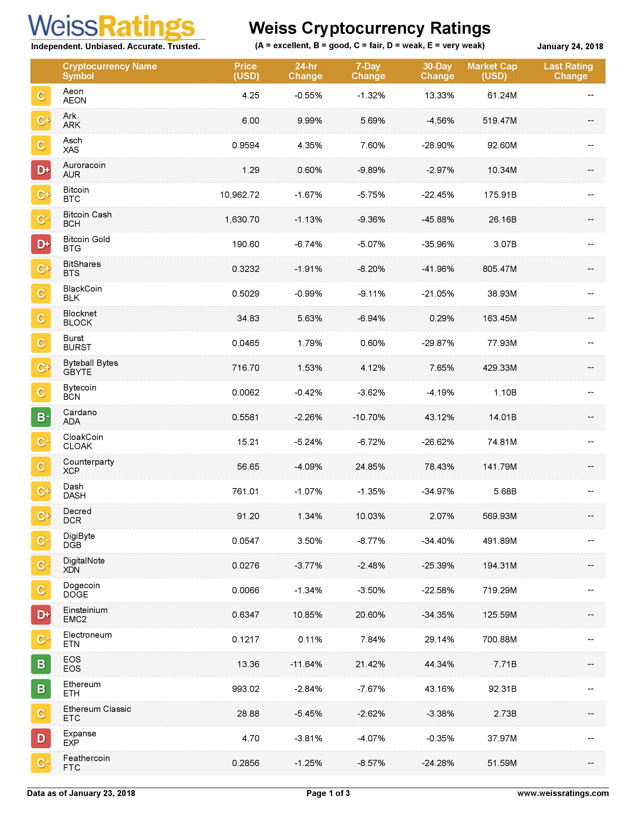 Kết quả bảng xếp hạng tín nhiệm đầu tiên của thị trường crypto do một cơ quan xếp hạng tín nhiệm (rating) độc lập của Mỹ – Weiss Ratings đã xếp hạng cho 74 đồng crypto tại địa chỉ website: http://finance.weissratings.com/crypto/ vào lúc 21h ngày 24.1.2018 giờ Việt Nam.