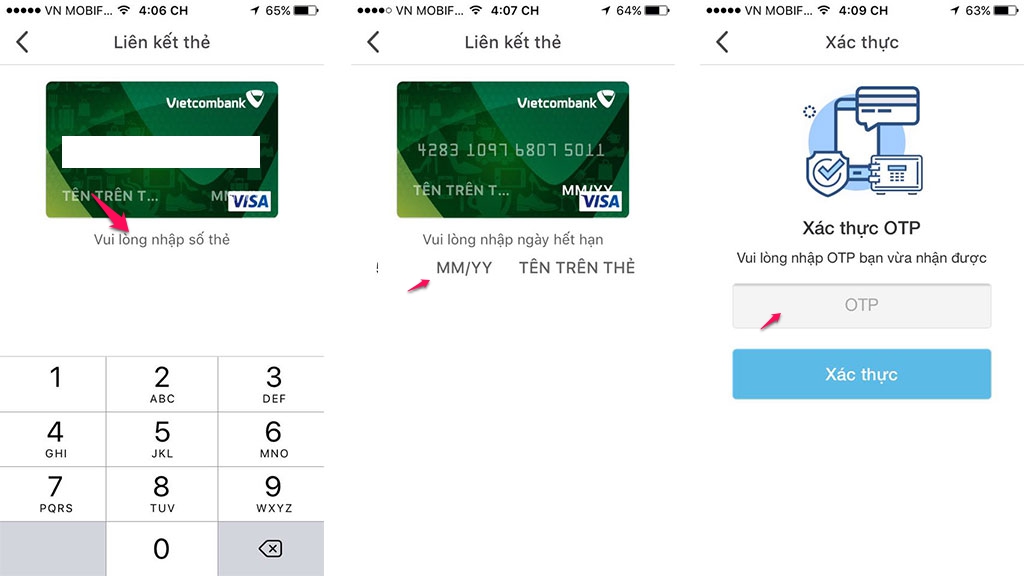 - Bước tiếp theo bạn nhập mã số thẻ được in trên mặt thẻ atm của mình, ở đây mình sử dụng thẻ Visa của ngân hàng Vietcombank. Tiến hành cung cấp đầy đủ thông tin để liên kết tài khoản. Mã xác thực OTP sẽ được gửi về qua tin nhắn.