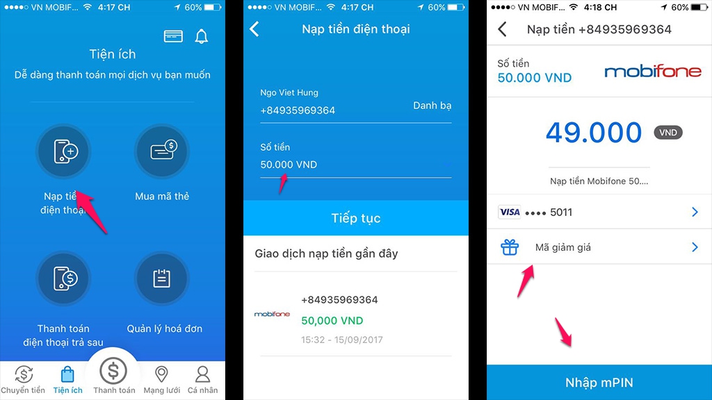 - Nhập mã khuyến mãi như hình. Sau đó bạn sẽ nhận được một tin nhắn chứa mã xác thực OTP. Tiến hành nhập password mà bạn muốn làm mã mPIN. Click Xác thực và tạo mPIN.
