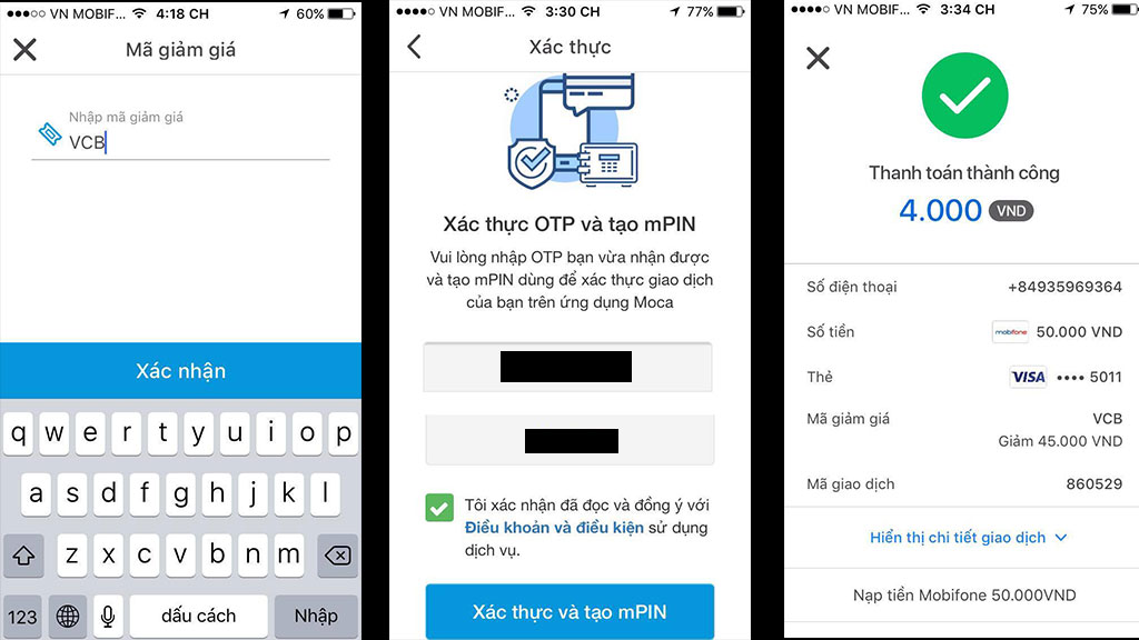 Cụ thể quý khách hàng lần đầu tiên đăng ký ứng dụng Moca và thanh toán bằng thẻ Vietcombank sẽ nhận được mã giảm giá khi nạp card.