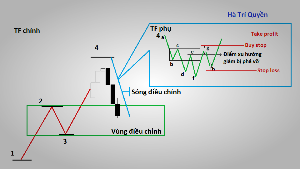 b. Giá phá xu hướng giảm và hình thành xu hướng tăng: Nhìn đồ thị ta xác định được điểm (e) là điểm mà xu hướng giảm bị phá vỡ nếu giá tăng và đóng cửa trên điểm (e). Khi giá tăng vượt khỏi điểm (e) phá vỡ xu hướng giảm, ta cần kiên nhẫn chờ đợi giá hình thành đỉnh (g) và điều chỉnh giảm về một khoảng tương đối (Bạn có thể sử dụng fibo hay bật TF nhỏ hơn nữa để dự báo điểm (h)). Chiến lược của chúng ta sẽ là Buy stop trên giá cao nhất của đỉnh (g), Stop loss dưới giá thấp nhất của đáy (h) và Take profit tại đỉnh (4) của xu hướng chính trên TF chính.