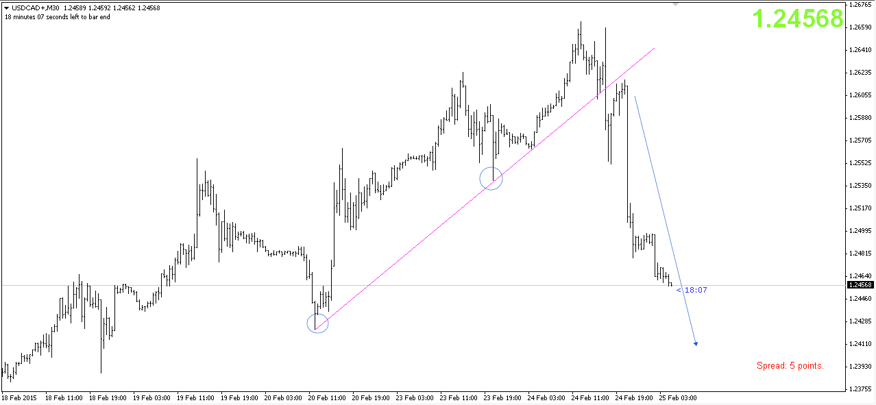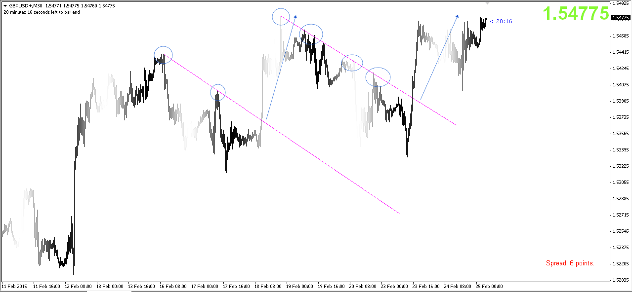 Đấy là biểu đồ cặp tỷ giá GBP/USD xem ở khung thời gian 30M (Khung 30 phút), theo kinh nghiệm cá nhân, Tôi sử dụng TF này để lướt sóng trong phiên. Nếu bạn cũng áp dụng chiến thuật Day Trading thì chỉ nên phối hợp tối đa 2 khung TF để tránh bị rối vì các TF khác nhau có thể chỉ ra xu hướng đối nghịch. Ví dụ cụ thể, sử dụng khung M30 để vào lệnh thì chỉ nên tham khảo thêm khung 1H để xem Trend dài hơn. Hiện tại có thể dễ dàng xác định Trendline hỗ trợ đã bị phá vỡ, đây là tín hiệu đảo chiều, thị trường có thể tăng giá mạnh bất cứ lúc nào vì không còn được kháng cự, chiến lược bây giờ là chỉ canh mua (BUY), tuyệt đối không nên bán lướt sóng.
