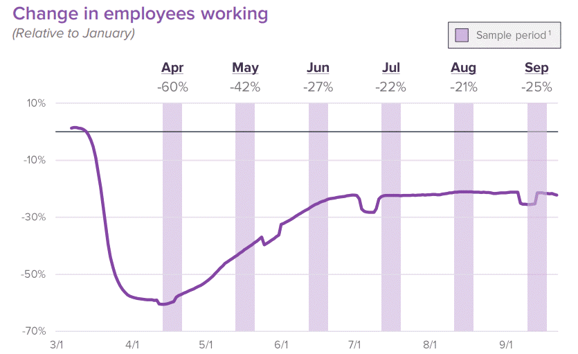 Một báo cáo kém lạc quan khác đến từ Homebase, họ lưu ý rằng dữ liệu của họ cho thấy chỉ số công việc đã giảm trong tháng 9 – lần đầu tiên sau 6 tháng.