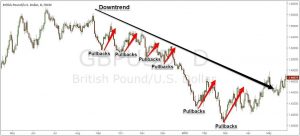 Pullback là những hành động giá đi ngược lại với xu hướng chính. Như hình trên, những cú pullback là sóng giảm trong xu hướng tăng. Hoặc như hình dưới, những cú pullback là sóng tăng trong xu hướng giảm: