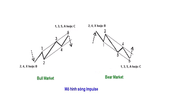 Mô hình Impulse xuất hiện ở các sóng 1,3,5 và các sóng A, C thuộc quá trình điều chỉnh (Correction). Mô hình này còn xuất hiện trong các quá trình điều chỉnh tại các sóng 2, 4, X hoặc B.