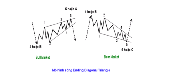 2. Mô tả:Mô hình sóng Ending Diagonal Triangle thuộc dạng mô hình sóng chủ thường xảy ra ở các sóng cuối một cấp độ sóng như sóng 5 hay sóng C. Không nên nhầm lẫn nó với các mô hình tam giác điều chỉnh.Mô hình sóng Ending Diagonal Triangle là hiện tượng tương đối hiếm đối với các cấp độ sóng lớn mà thường xuất hiện ở các cấp độ sóng thấp hơn trên các đồ thị giá trong ngày (intraday). Thường thì theo sau mô hình Diagonal Triangle là sự thay đổi mạnh về xu hướng thị trường.3. Quy tắc: