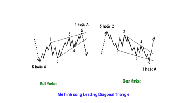 2. Mô tả:Mô hình sóng Leading Diagonal Triangle thuộc dạng mô hình sóng chủ thường xảy ra ở đầu một cấp độ sóng như sóng 1 hay sóng A hay nói cách khác nó nằm trong sóng 1 hoặc sóng A. Không nên nhầm lẫn nó với các mô hình tam giác điều chỉnh. Điểm khác của mô hình này với mô hình Ending Diagonal Triangle là các sóng 1, 3 và 5 có cấu trúc sóng bên trong gồm 5 sóng chứ không phải 3 sóng như mô hình Ending Diagonal Triangle.Cũng như mô hình sóng Ending Diagonal Triangle thì mô hình sóng Leading Diagonal Triangle là hiện tượng tương đối hiếm đối với các cấp độ sóng lớn mà thường xuất hiện ở các cấp độ sóng thấp hơn trên các đồ thị giá trong ngày (intraday). Thường thì theo sau mô hình Diagonal Triangle là sự thay đổi mạnh về xu hướng thị trường.3. Quy tắc: