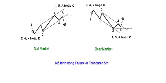 2. Mô tả:Mô hình sóng Failure or Truncated 5th (mô hình sóng chủ thất bại tại sóng 5 – hay sóng 5 cụt) thuộc dạng mô hình sóng chủ mà sóng 5 không vượt qua được sóng 3. Sóng 5 chỉ đến gần đỉnh sóng 3. Mô hình này cho thấy xu hướng yếu và thị trường sẽ nhanh chóng chuyển hướng theo xu hướng ngược lại.3. Quy tắc: – Mô hình Failure or Truncated 5th bao gồm 5 sóng.– Sóng 2 không dài hơn về khoảng cách giá so với Sóng 1 vì thế sẽ không vượt qua điểm khởi nguồn của Sóng 1.